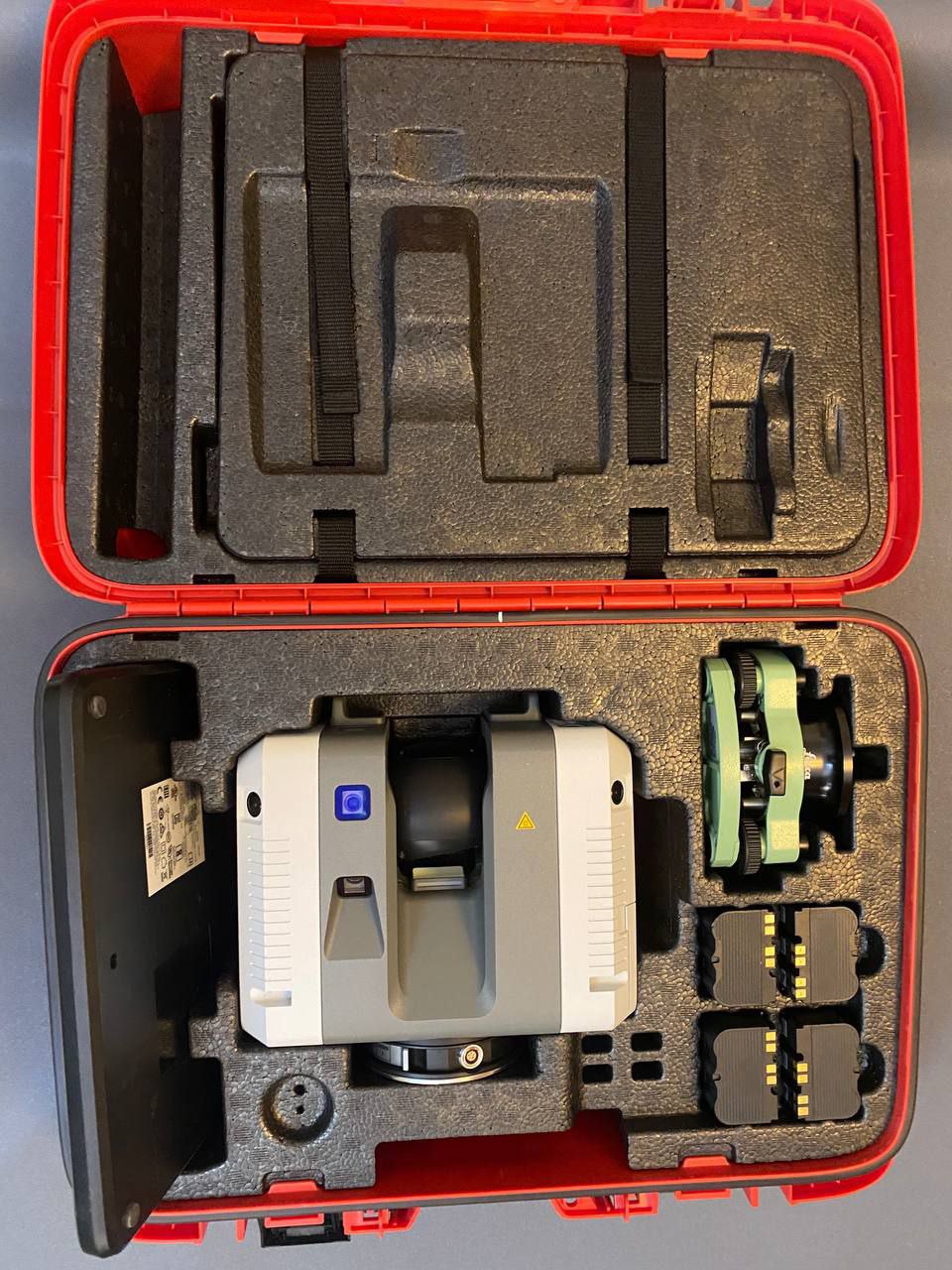 Leica RTC360 в отличном визуальном состоянии, аккуратно хранился в фирменном ударопрочном кейсе (видно на фото). В комплекте сканер, поворотное основание/адаптер, несколько аккумуляторов и фирменная 4‑гнёздная зарядная станция Leica - полный рабочий набор «из коробки».
